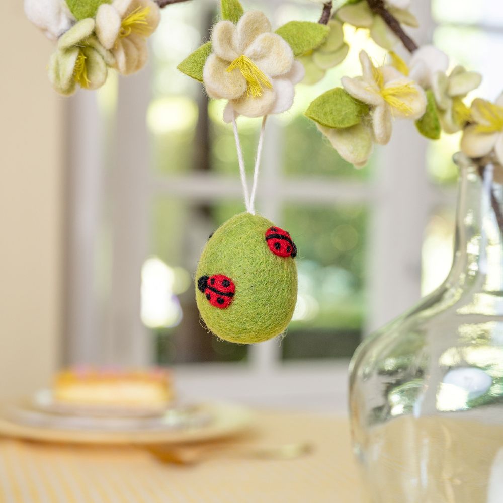 Breng een frisse, vrolijke lentesfeer in huis met deze lichtgroene eitjes, speels versierd met bijtjes, lieveheersbeestjes en fijne margrietjes. De hangers zijn met de hand gemaakt van duurzaam vilt en hebben een natuurlijke, warme uitstraling waardoor elk exemplaar even uniek is. Dankzij het handige ophangtouwtje hang je ze eenvoudig in een (paas)tak, aan een kastknop of als subtiele lenteversiering in huis.