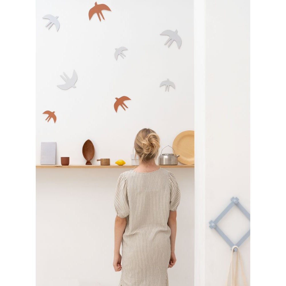 Deze kleine zwerm zwaluwen voelen zich thuis in zoete pastel-interieurs, in minimalistische hoge ruimtes met aardetinten en op donker gekleurde muren. Maar door hun rustige kleuren passen de vogels ook fantastisch mooi in bijvoorbeeld een babykamer. Toch liever een grote zwerm Zwaluwen, voeg dan meerdere sets samen!