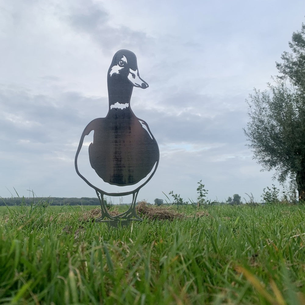 De wilde eend is een veel voorkomende watervogel in parken en vijvers. Het mannetje heeft een groene kop en witte nekband, plus gekrulde staartveren. Het vrouwtje is bruin. In de winter vormen ze koppeltjes, soms met heftige concurrentie. Veel parkeenden zijn mengvormen met gedomesticeerde eenden. Gemaakt van 3 mm dik weersbestendig Cortenstaal.