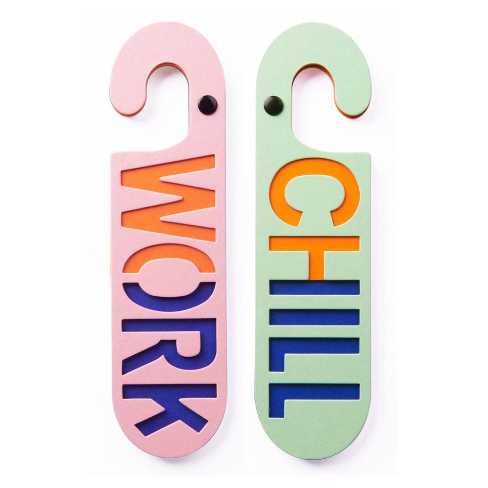Met de deurhanger Work / Chill van Carmela Bogman maak je op een stijlvolle én eenvoudige manier duidelijk waar je mee bezig bent – zonder een woord te zeggen. Ideaal voor thuis, op kantoor of in een hotelkamer.