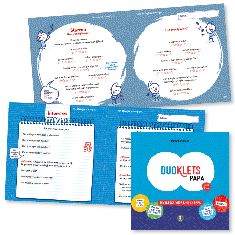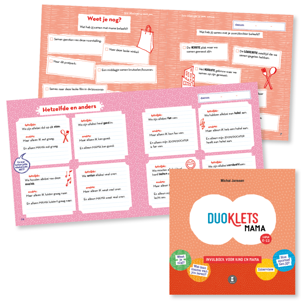 Duoklets is een bijzonder boekje met vragen, keuzelijstjes en aankruishokjes. Elke linkerpagina is voor het kind en elke rechterpagina is voor mama/papa/oma/opa. Ontdek hoe goed je elkaar kent, denk terug aan wat jullie samen hebben beleefd en interview elkaar over serieuze én gekke onderwerpen. Superleuk om samen in te vullen en je bewaart een prachtige herinnering voor later.