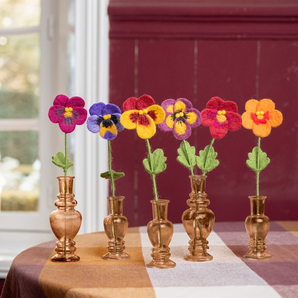 Deze prachtige viooltjes gemaakt van zacht en delicaat merino-wolvilt hebben een unieke uitstraling en zijn met veel aandacht en zorg met de hand gemaakt. In de stengel van de bloem is metaaldraad verwerkt, wat betekent dat je de bloem gemakkelijk in verschillende vormen kunt buigen. Dit geeft je de mogelijkheid om het viooltje te stylen zoals jij dat graag wilt. Het is een geweldige toevoeging aan elk vaasje en zorgt voor een vrolijke en sfeervolle sfeer in je huis.
