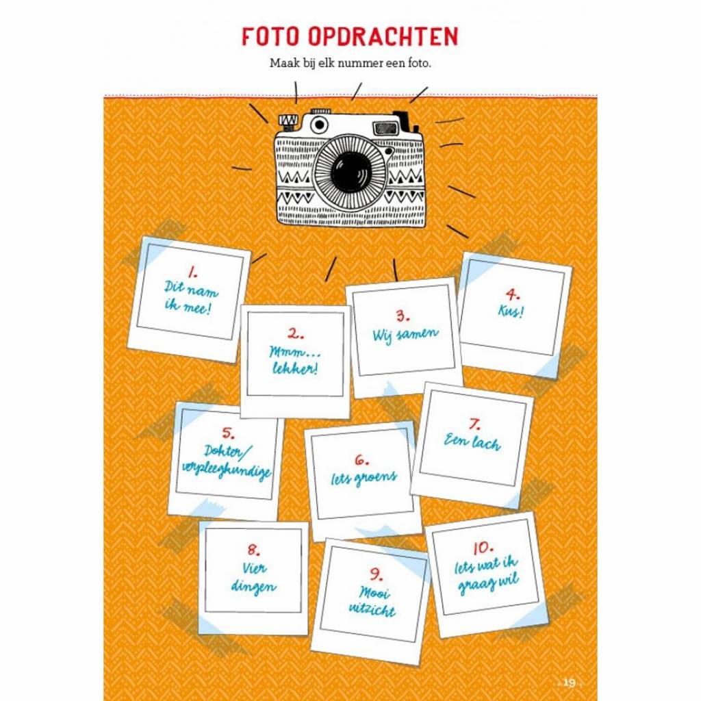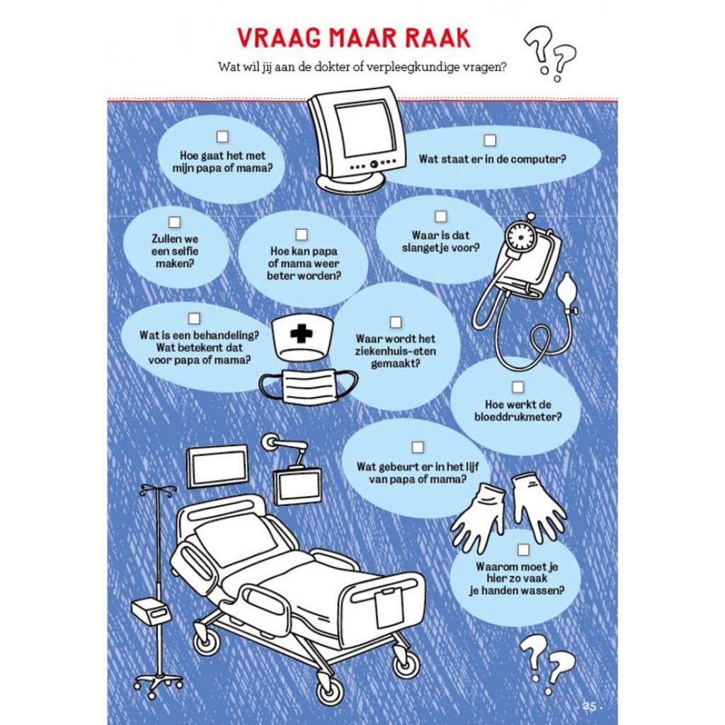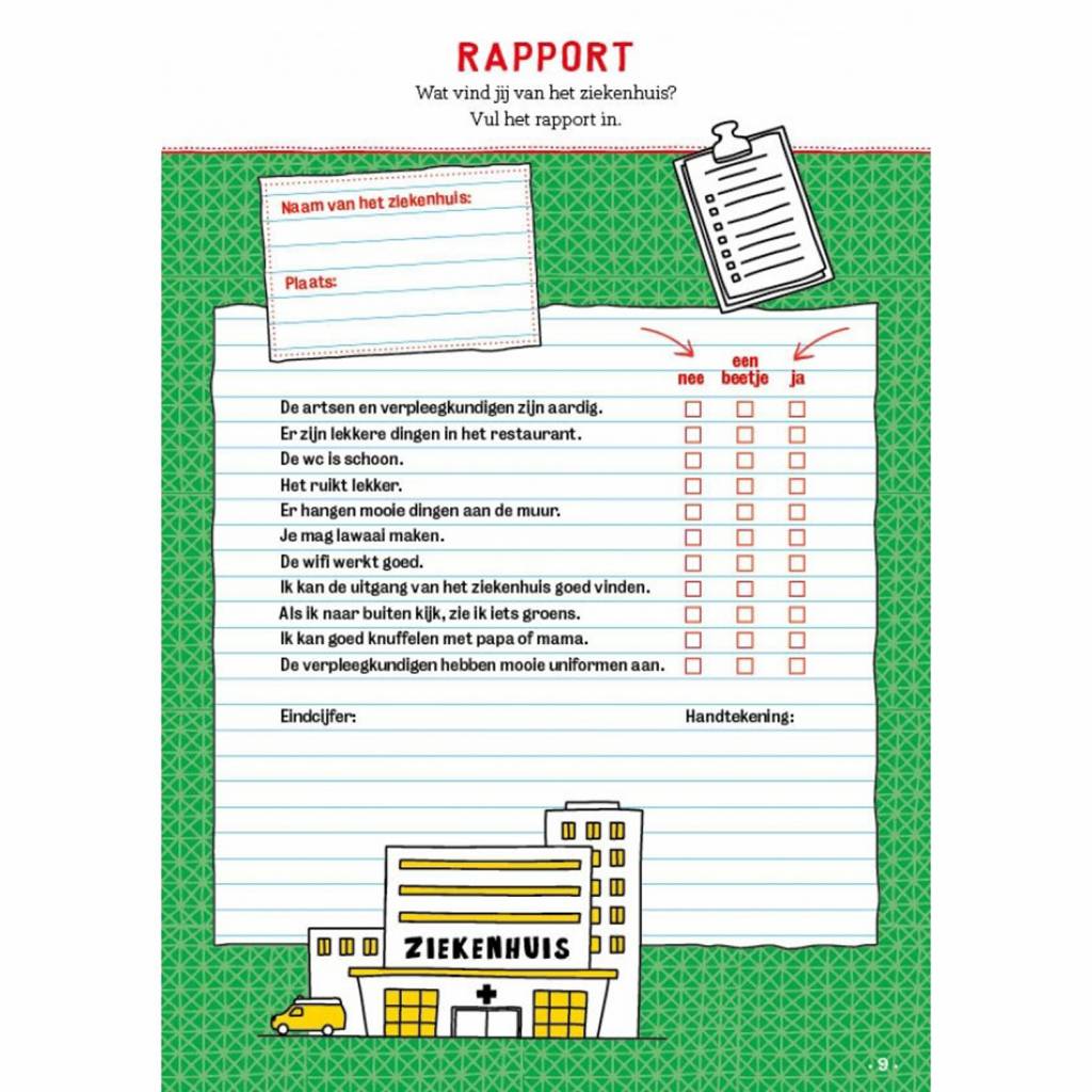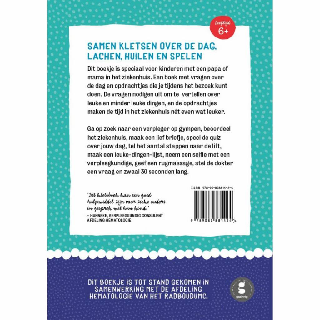 Ziekenhuisklets (6+) is een invulboek met vragen over de dag en opdrachtjes die je tijdens het bezoek kunt doen. De vragen nodigen uit om te vertellen over leuke en minder leuke dingen, en de opdrachtjes maken de tijd in het ziekenhuis nét even wat leuker. Ga op zoek naar een verpleger op gympen, beoordeel het ziekenhuis, maak een lief briefje, speel de quiz over jouw dag, tel het aantal stappen naar de lift, maak een leuke-dingen-lijst, neem een selfie met een verpleegkundige, geef een rug massage, stel de dokter een vraag en zwaai 30 seconden lang.